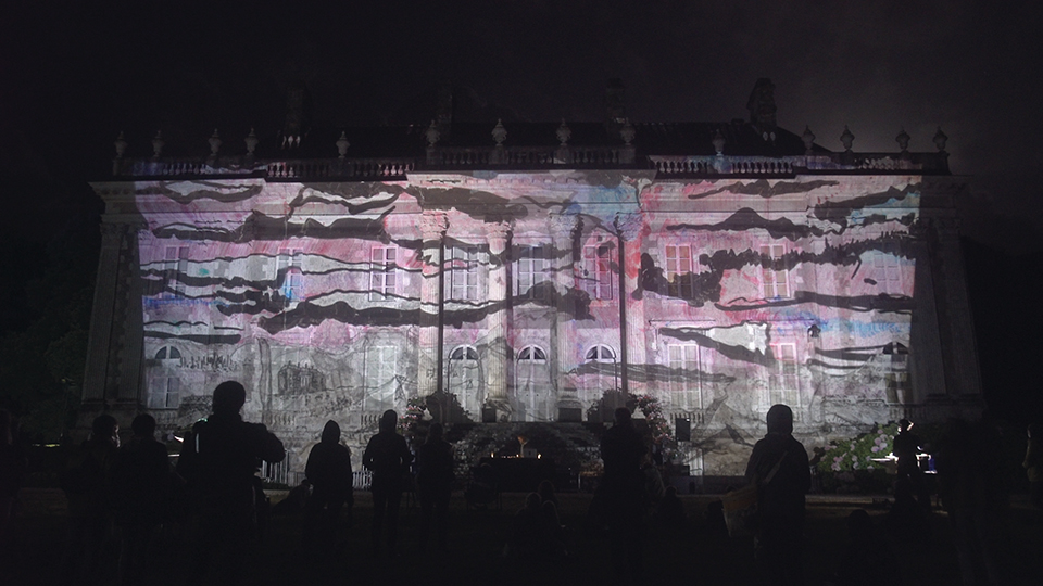 Un ensemble de sculptures et d’instruments disposé près d’une source lumineuse est utilisé par les artistes pour créer des projections sur la totalité du mur.